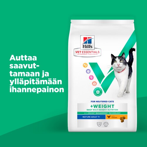 Ainoastaan eläinlääkäreiltä saatava kanaa sisältävä Hill’s VET ESSENTIALS MULTI-BENEFIT + WEIGHT Mature Adult 7+ -kissanruoka on monivaikutteinen täysravinto 7-vuotiaille ja sitä vanhemmille ikääntyville aikuisille kissoille. Kissa saa siitä tärkeitä kliinisesti todistettuja hyötyjä esimerkiksi kliinisesti toimivaksi todistetun painonhallintateknologian ansiosta, joka auttaa polttamaan liiallista rasvaa ja säilyttämään ihannepainon sterilisaation/kastraation jälkeen. Lisäksi ruoassa on vastustamaton maku, johon kissa ihastuu taatusti.