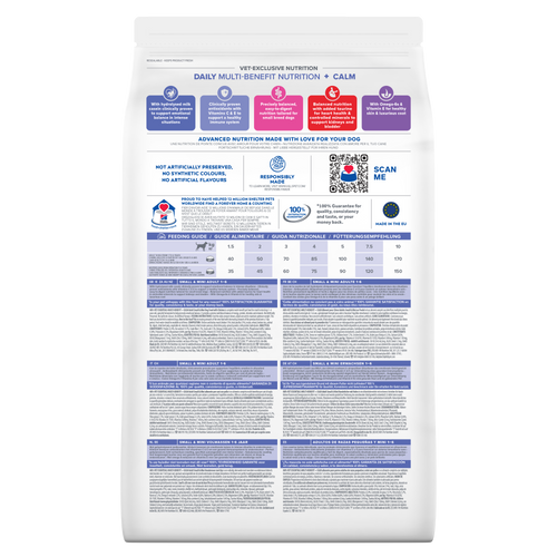 Kanaa sisältävä Hill’s VET ESSENTIALS MULTI-BENEFIT + CALM Adult Small & Mini -koiranruoka on monivaikutteinen täysravinto pienten ja kääpiörotujen 1–6-vuotiaille koirille. Se on kehitetty erityisesti avuksi edistämään emotionaalista tasapainoa. Sisältää energiaa, proteiinia, vitamiineja ja kivennäisaineita tarkasti tasapainotetussa suhteessa.